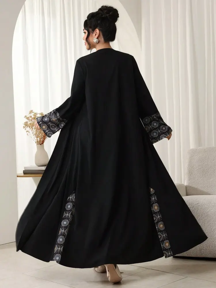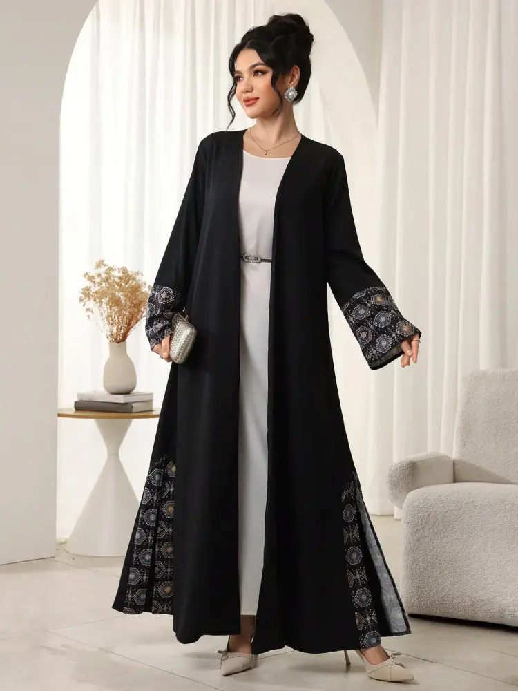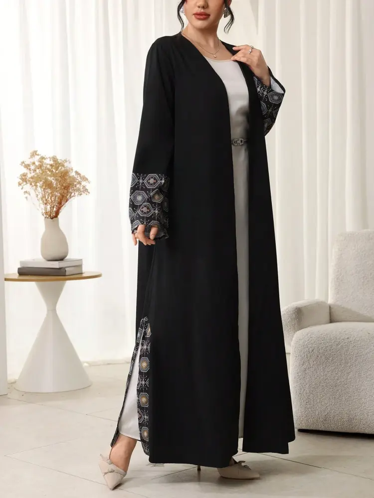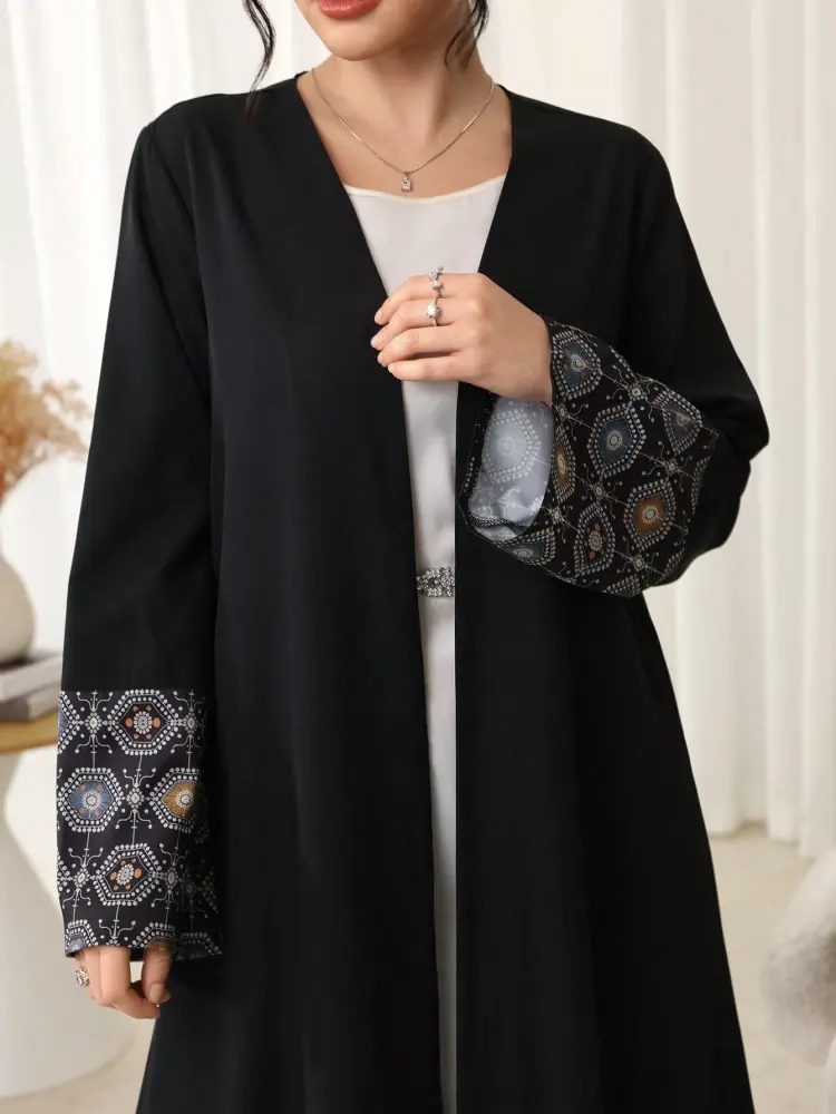 - عباية مطرزة الاكمام تصميم أكمام واسعة مزينة بتطريز هندسي يضفي لمسة فخامة وأناقة